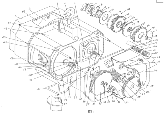一種節(jié)能安全的微型電動葫蘆(圖1)包括具有第一殼腔(47)的主殼體(49)、配置在主殼體(49)一端的具有第二殼腔(52)的第一罩殼(1)、配置在主殼體另一端的具有第三殼腔(53)的第二罩殼(24)和彼此平行地并且以臥置狀態(tài)地設(shè)置在第一殼腔(47)中的滾筒機構(gòu)(51)和電機(2),其特征在于:電機(2)為直流永磁電機;第三殼腔(53)內(nèi)設(shè)置有一用于對滾筒機構(gòu)(51)實施制動的并且對滾筒機構(gòu)(51)超限吊重作出響應(yīng)的制動機構(gòu)(54),該制動機構(gòu)(54)分別與滾筒機構(gòu)(51)和電機(2)傳動聯(lián)結(jié)。(北京凌鷹)