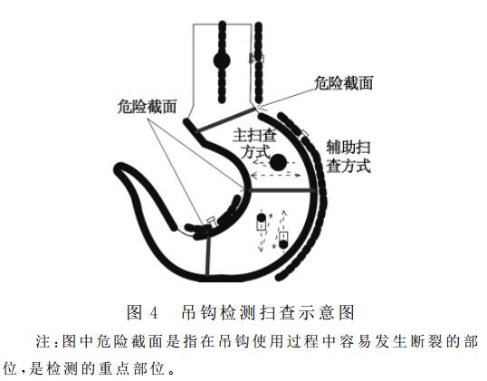 為防止缺陷漏檢,按圖4進行掃查直探頭采用接觸式在鉤柄圓柱、鉤腔、鉤腔外圓弧和鉤頭一側(cè)表面垂直于鍛造流線方向做鋸齒形掃查。掃描線按聲程1:1調(diào)節(jié),以2平底孔為掃 查靈敏度,3平底孔為評定線靈敏度,耦合補償用試塊和工件實際測定。斜探頭在鉤頭兩側(cè)面沿鍛造流線方向做平行掃查和斜探頭在鉤腔內(nèi)表面垂直于鍛造易折疊部位做鋸齒型掃查,掃描線速度按聲程1:1調(diào)節(jié),靈敏度按2.4.3調(diào)節(jié),耦合補償用試塊和工件實際測定。確因鍛件幾何形狀的限制而掃查不到的部位,應予以記錄和圖示,必要時還應得到各方同意。