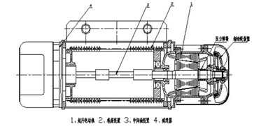 MD1型電動葫蘆比CD1型電動葫蘆多了一臺起升輔電機。起升主電機和起升輔電機均為帶錐形制動器的錐形轉子電機,兩電機之間由慢速驅動裝置組合,它包括小齒輪(與起升輔電機相連),中間齒輪和在齒輪(與起升主電機的制動器座相連)。