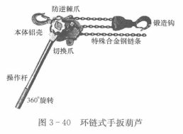 1、環(huán)鏈?zhǔn)绞职夂J(見圖3-40)??堪鈩邮直?,通過傳動機構(gòu)帶動起重鏈條升降重物。環(huán)鏈?zhǔn)绞植话埠J是設(shè)備安裝,貨物起吊、物體固定、綁扎和牽引的理想工具,尤其是任意角度的牽引和在場地狹小,露天作業(yè)及無電源的情況下,更顯示其優(yōu)越性。