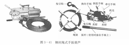 2、鋼絲繩式手扳葫蘆。鋼絲繩式手扳葫蘆(見圖3-41),又稱橫向牽引機,它不但能作一般牽引、卷揚、起重工作。而且還能在傾斜高低不平的狹窄地帶和曲折轉(zhuǎn)彎的條件下進(jìn)行工作。