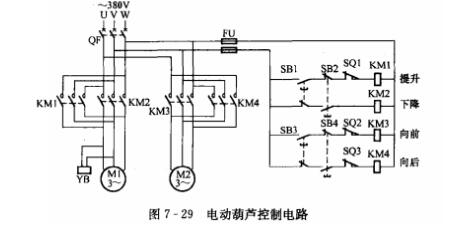電動葫蘆是一種小型起重機械,多用于設(shè)備的吊裝工作是工廠常用的移動工具之一,起重葫蘆葫蘆由吊鉤和移動行車兩部分組成,吊鉤的提升和行車行進(jìn)各有一臺電動機推動。提升電動機帶動滾筒轉(zhuǎn)動,從而帶動吊鉤的提升或下降;行進(jìn)電動機拖動提升機構(gòu)在工字梁上水平移動,從而帶動行車前進(jìn)或后退。其控制電路如圖7-29所示。