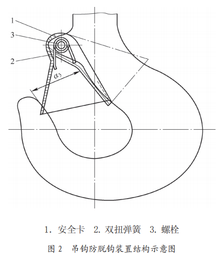 吊鉤防脫鉤裝置:該吊鉤防脫鉤裝置為卡片式結構,該裝置由安全卡、雙扭彈簧、螺栓組成,如圖2所示。經(jīng)現(xiàn)場檢查,事發(fā)后安全卡處于吊鉤開口以外非正常工作位置。安全卡長110mm,款39mm,安全卡無明顯變形,雙扭彈簧功能有效,螺栓緊固完好。通過將安全卡恢復到正常工作位置后手動測試,安全卡動作復位靈活,防脫鉤裝置具備正常防脫鉤功能。