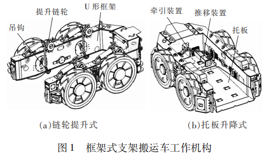框架式支架搬運車主要用來拖運支架,如圖1所示,其工作機構是基于U形框架的鏈輪提升式(或托板升降式)支架裝載機構。鏈輪提升式機構是利用4 個吊鉤鉤住支架起吊環(huán),通過操作提升鏈輪動作實現(xiàn)支架的提升裝載。倘若U形框架內(nèi)寬設計較窄,待支架進入框架時,支架兩側(cè)剩余空間較小,增加了工人的掛鉤難度,影響了支架的裝卸速度;另外,倘若提升鏈輪的離地高度設計較高,待支架進入框架時,壞損支架的側(cè)護板處于張開狀態(tài),張開的側(cè)護板極易與提升鏈輪發(fā)生碰撞,阻礙支架進入框架,同樣影響了支架的裝載速度。托板升降式機構的裝卸架原理是在裝架時落下托板,利用牽引裝置將支架牽引至框架內(nèi),卸架時利用推移裝置將支架推出框架,以此實現(xiàn)支架的裝卸。倘若在使用過程中,托板滾輪卡滯,加之牽引裝置繩力設計有限,則會導致裝架困難;倘若推移裝置推出時,其導向套筒發(fā)生變形別卡,則會導致卸架困難,進而影響了支架搬運車的作業(yè)效率。