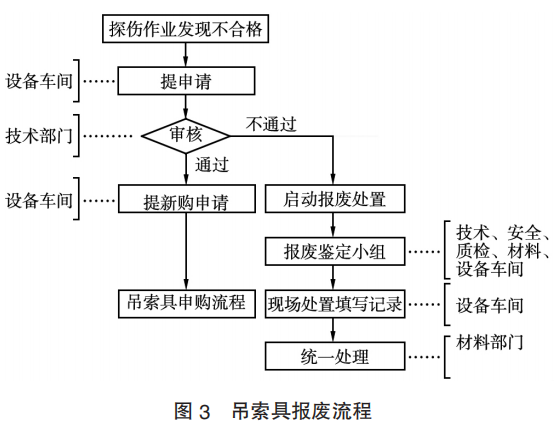 當探傷發(fā)現有不合格吊索具時,由設備車間提報報廢申請,報技術部門審核,通過后設備車間組織報廢鑒定小組進行現場處置并填寫臺賬記錄,同時由材料部門處置并新購。