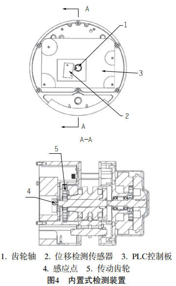 內(nèi)置式高度檢測裝置如圖4所示,它主要由齒輪軸、位移檢測傳感器和PLC控制板組成。齒輪軸位于電動葫蘆內(nèi),齒輪軸貫穿PLC控制板,PLC控制板上設(shè)有位移檢測傳感器,位移檢測傳感器位于齒輪軸旁,PLC控制板與位移檢測傳感器電連接,齒輪軸上設(shè)有感應(yīng)點(diǎn),感應(yīng)點(diǎn)與位移檢測傳感器配合。根據(jù)不同葫蘆的結(jié)構(gòu),在葫蘆電機(jī)的齒輪軸上,布置一個凸起或凹陷的感應(yīng)開關(guān)感應(yīng)點(diǎn)用于檢測該軸的轉(zhuǎn)動圈數(shù)。電動葫蘆必須配置控制的PLC或單片機(jī),用于處理感應(yīng)開關(guān)檢測到軸的轉(zhuǎn)動圈數(shù)。每臺環(huán)鏈電動葫蘆會根據(jù)實際鏈條長度,預(yù)先在程序中設(shè)定好鏈條的首位限位點(diǎn)。PLC或單片機(jī)程序設(shè)定好檢測的軸與起重鏈條運(yùn)行距離的比例,再根據(jù)檢測軸轉(zhuǎn)動的圈數(shù)計算出鏈條運(yùn)行的距離,實時計算出吊鉤的高度,當(dāng)鏈條運(yùn)行到限位點(diǎn)時會自動停機(jī),起到限位的作用。
