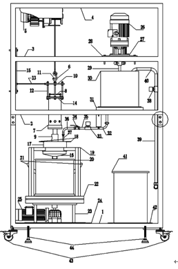 攪拌裝置,就是在第三層支架3的右側(cè)有一臺攪拌電機26,攪拌電機26豎直倒立放置。將攪拌電機的法蘭27用螺絲固定在支架層3上的架板28上。在攪拌電機26的旋轉(zhuǎn)軸上接攪拌器29,攪拌電機26正下方有一個圓柱形儲水桶30,攪拌器29需能夠伸入到儲水桶30中,儲水桶30被螺絲固定在第二層支架2右側(cè)的架板31上。儲水桶30底部有一出水孔,鋼制水管32成90度,其一端連接在該孔,另一端與電磁閥33的一端相連,電磁閥33的另一端與止水閥門34的一端用鋼制水管35相連。鋼制水管36成90度,其一端與止水閥門34的另一端相連,鋼制水管36的另一端與軟水管37的一端相連,軟水管37的另一端需能夠伸入到漏斗無底圓柱形水桶18中。支架右側(cè)有一進水管39,進水管39一端接水源,另一端接電磁閥38的一端,電磁閥38的另一端與U形水管40的一端相連,U形水管40的另一端伸入到儲水桶30中。