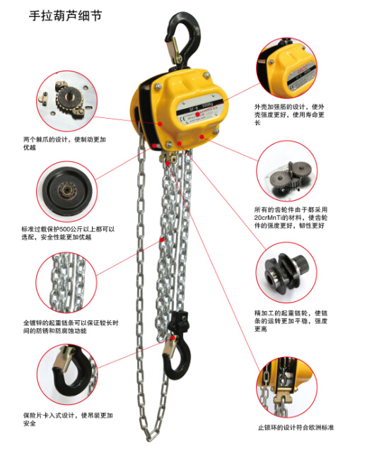 3、 符合人體設(shè)計(jì)工學(xué)的手柄使該葫蘆易于操作。